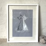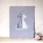 Original linocut handprinted on handmade deckle edged Panart paper from India, which has blue grey hue. The cats are sitting on a watercolored holographic rainbow cloud.