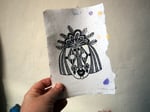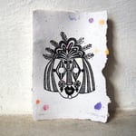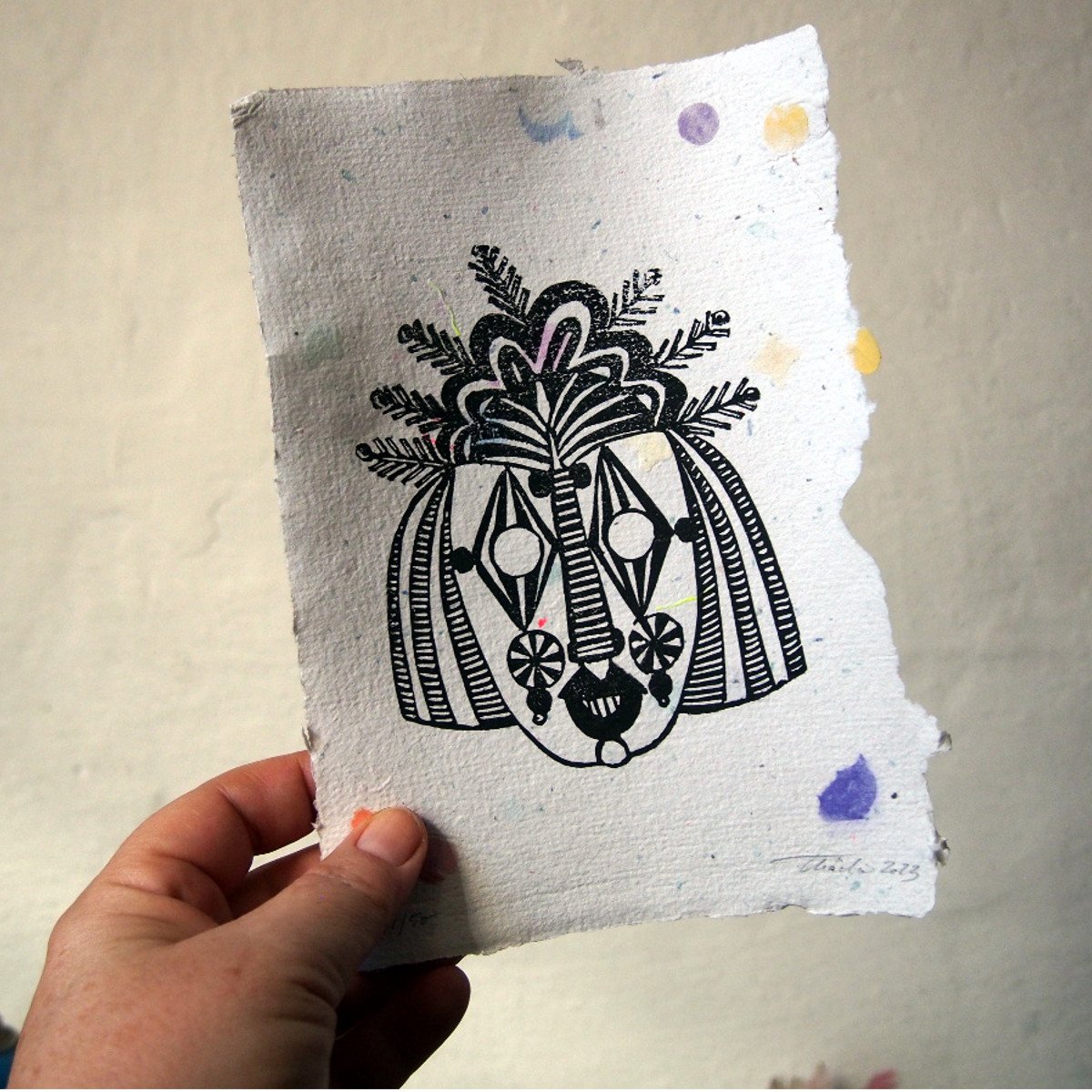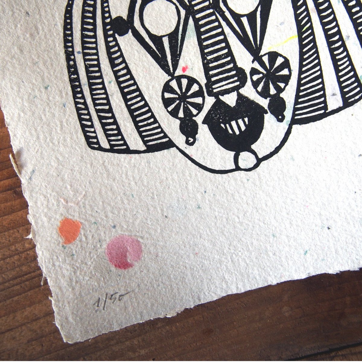 Origínal Linolschnitt auf selbstgeschöpftem Konfettipapier.