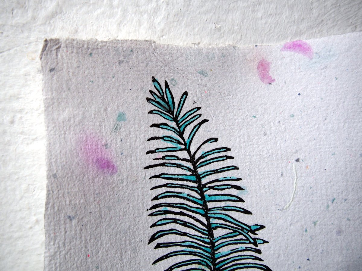 Origínal Linolschnitt auf selbstgeschöpftem Konfettipapier.