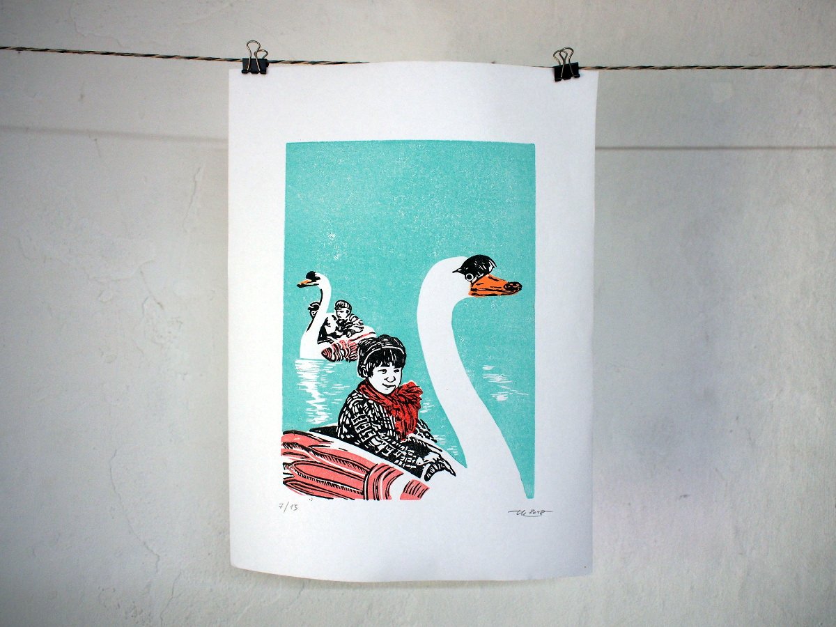 Linoldruck - Schwanensee