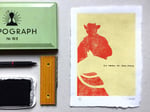 Linocut print on offwhite, deckle-edged paper. The lettering was handstamped with a vintage type stamp set.