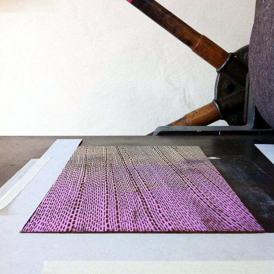 Gedruckt mit in zwei Farbschichten und meiner alten Breisch-Druckpresse auf naturweißes Dorée Zeichenpapier, 120g/qm.